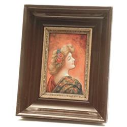 A late 19th/early 20th century French enamel rectangular plaque decorated with a portrait of a lady, 5.5ins x 3.5ins £150-200