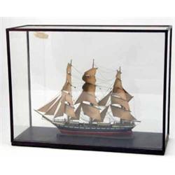 A late 19th/early 20th century ship model in case, the three masted clipper with sails and rigging in a glazed mahogany case, 18 by 24 by 9 ins. £300-500