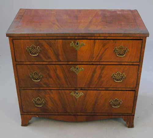 A late George III cross banded mahogany chest, of three long drawers with ebony stringing, on splayed bracket feet 2ft 11ins £400-600