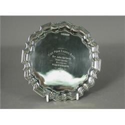 A late George V Walker & Hall silver card tray on three scroll feet, engraved 'High Peak Ladies Race ...', hallmarked Sheffield 1933, 15.5cm diameter, 60ozs Est. 100/150