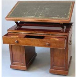 A late Georgian mahogany architects desk with double ratcheted leather lined top, frieze drawer w...