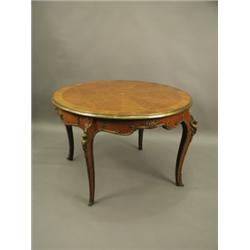 A late Victorian circular kingwood centre table, the top crossbanded and segmentally veneered, with a moulded gilt metal edge, the shaped frieze and cabriole legs with cast bronze mounts, 1.22m diameter