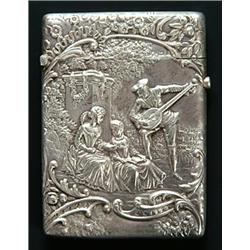 A late Victorian embossed silver card case, the front depicting a minstrel serenading two ladies...
