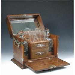 A late Victorian oak tantalus and games box, the rectangular lid opening over five tumblers, two decanters and stoppers and two drawers containing cards and whist marker, the box 32cm wide £250-350
