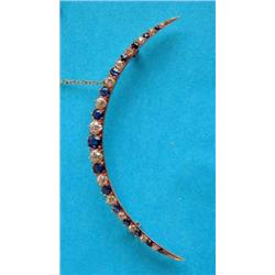 A late Victorian sapphire and diamond open crescent brooch, claw-set in gold with a graduated row of alternating sapphires and diamonds £700-900