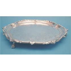 A late Victorian silver salver of lobed hexagonal form with floral scroll engraving, on claw and ball feet, makers Martin Hall & Co., Sheffield 1900 (30ozs) £250-300