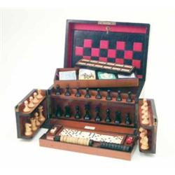 A late Victorian walnut games compendium, with swing doors and compartmented interior containing...