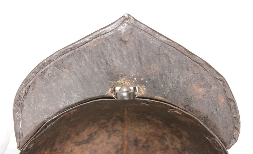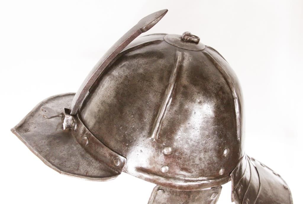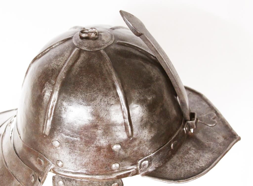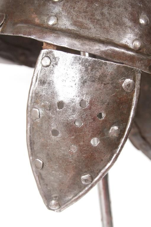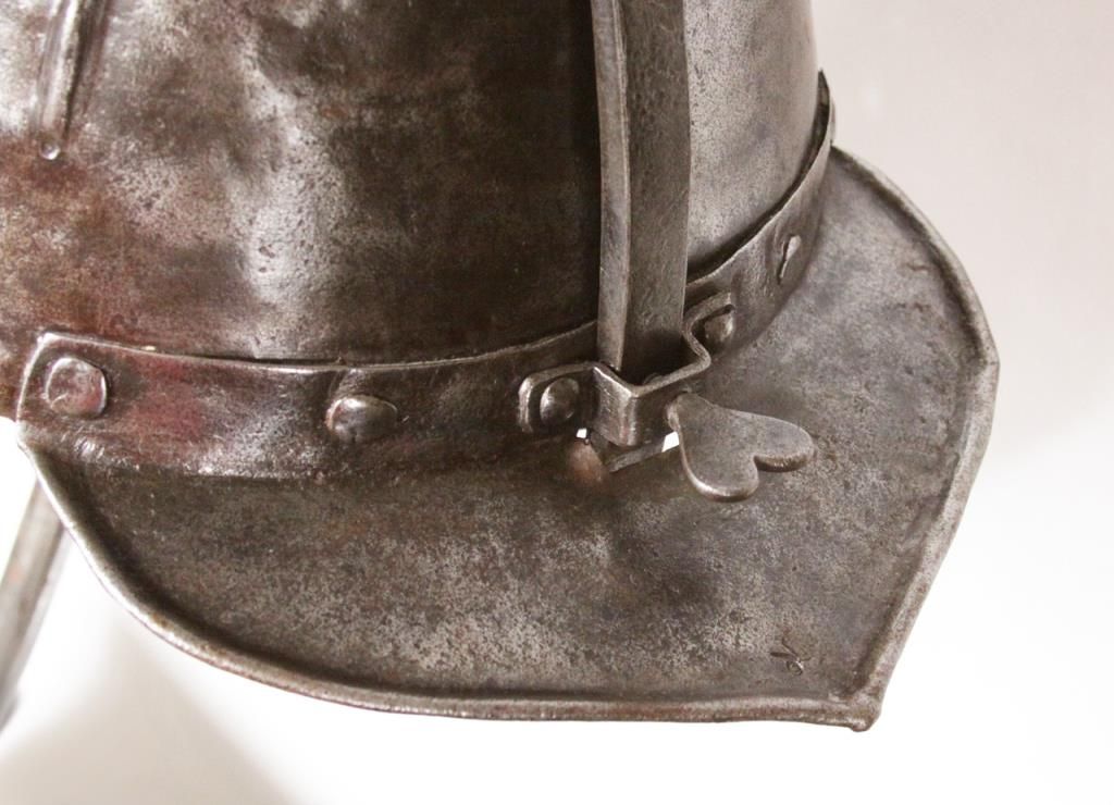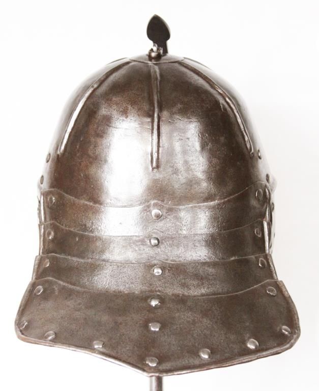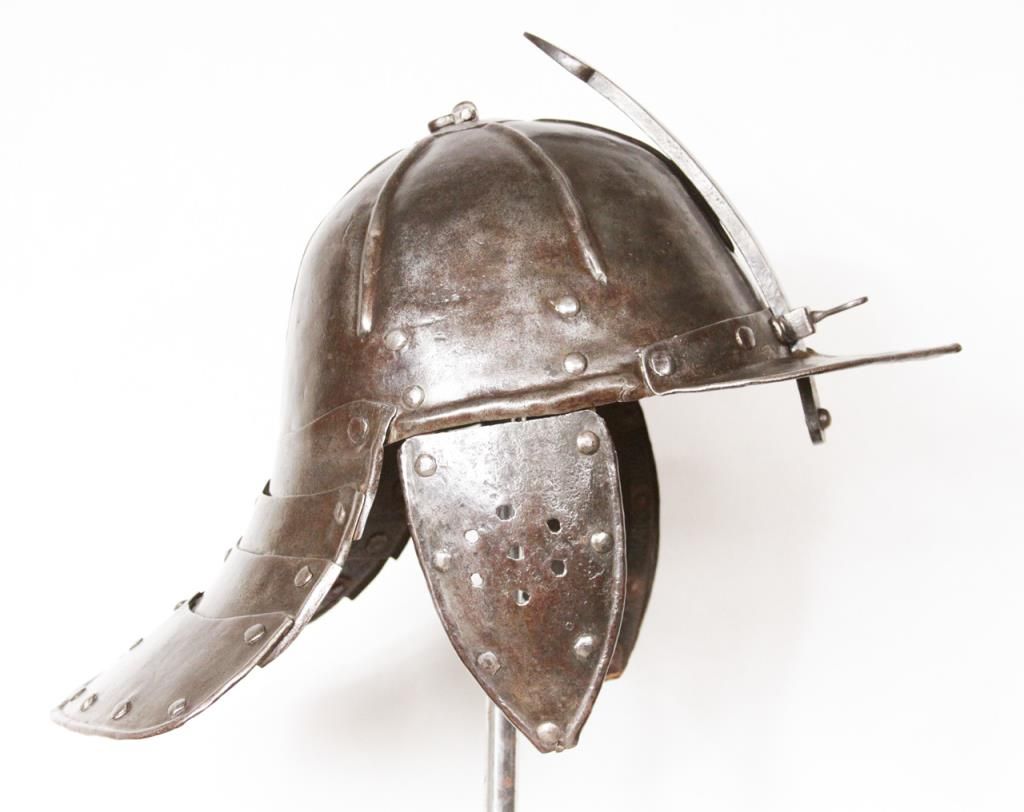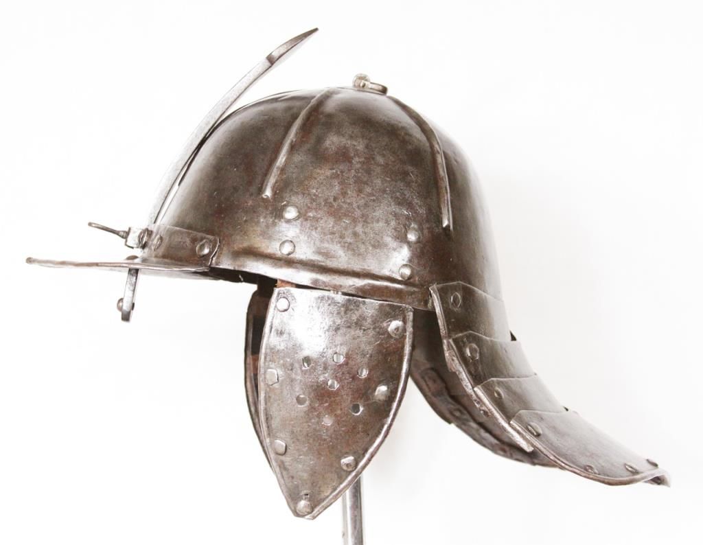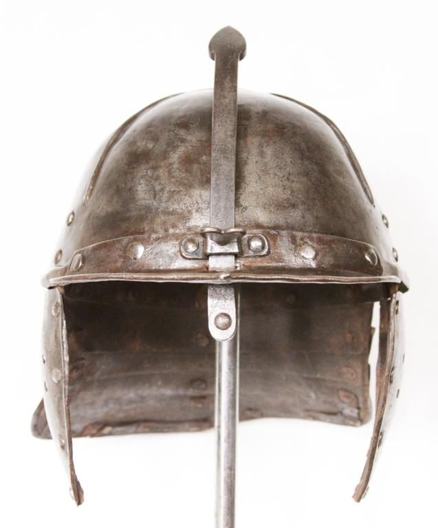 A lobster-tail helmet made in Europe, possibly English. This type of helmet was widely used during the Thirty Years War (1618-1648) and the English Civil War (1642-1651). This helmet consist of a one piece steel bowl with appliedvisor, four lames protecting the neck and a pair of ear flaps, all with rolled edges. Also has an adjustable sliding nasal bar. Maker’s marks on the visor both on the top and bottom. Early-middle 17th century. Great condition,leather holding ear flaps has been replaced but was done correctly and shows some age. Bowl measures tall 5 ½”and 9 ½” wide. Measures 17 ½” overall. Est.: $1,750-$2,250.