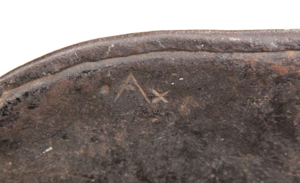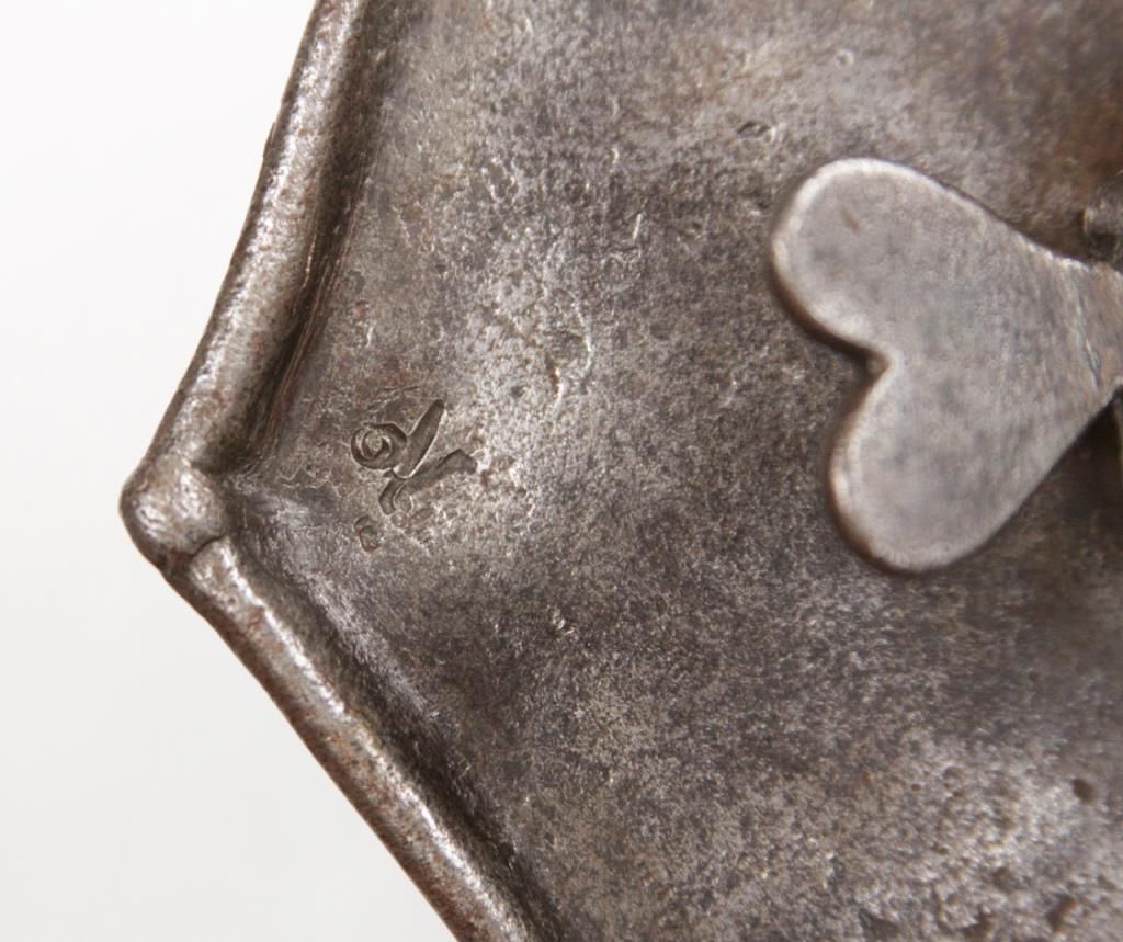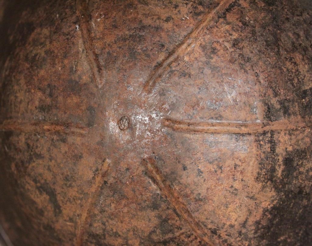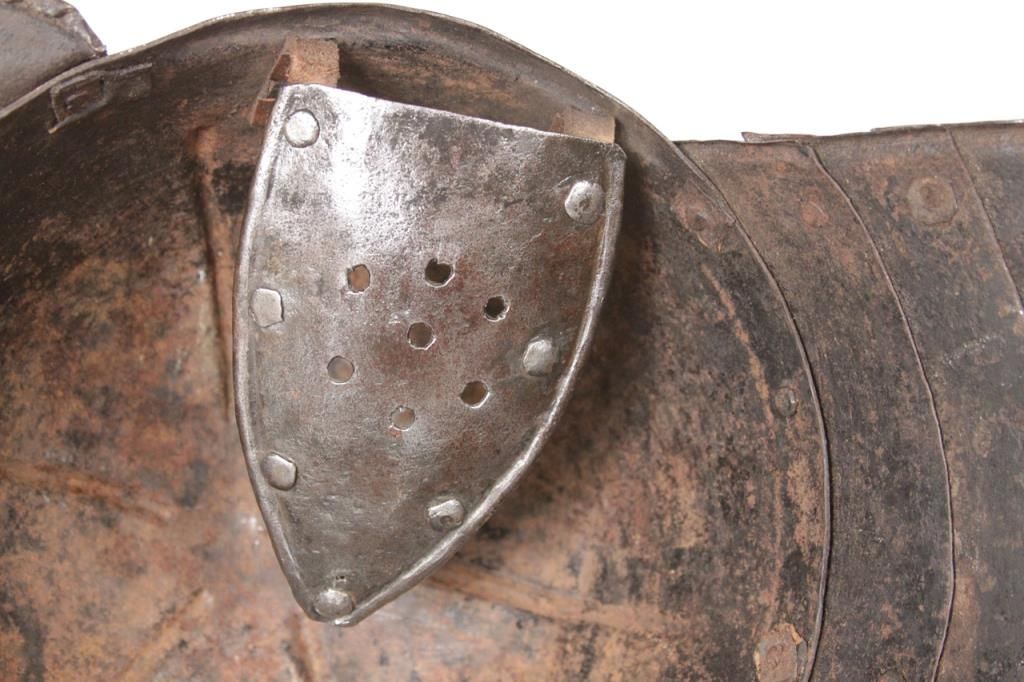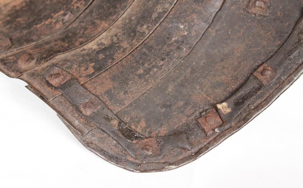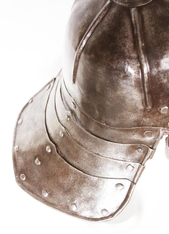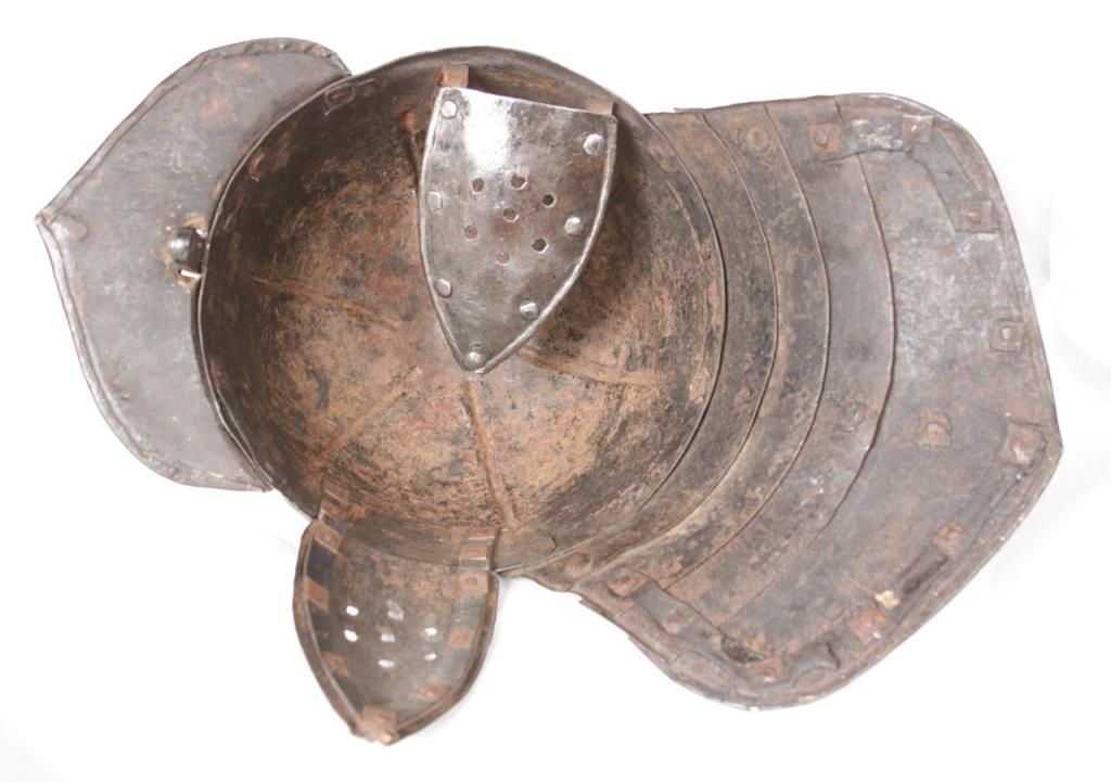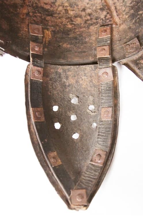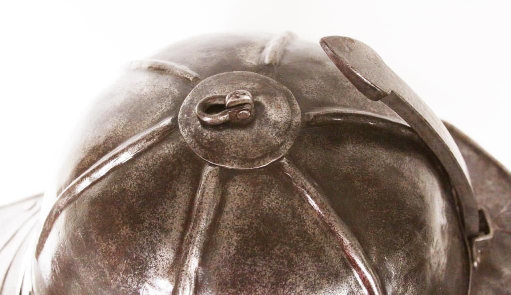 A lobster-tail helmet made in Europe, possibly English. This type of helmet was widely used during the Thirty Years War (1618-1648) and the English Civil War (1642-1651). This helmet consist of a one piece steel bowl with appliedvisor, four lames protecting the neck and a pair of ear flaps, all with rolled edges. Also has an adjustable sliding nasal bar. Maker’s marks on the visor both on the top and bottom. Early-middle 17th century. Great condition,leather holding ear flaps has been replaced but was done correctly and shows some age. Bowl measures tall 5 ½”and 9 ½” wide. Measures 17 ½” overall. Est.: $1,750-$2,250.