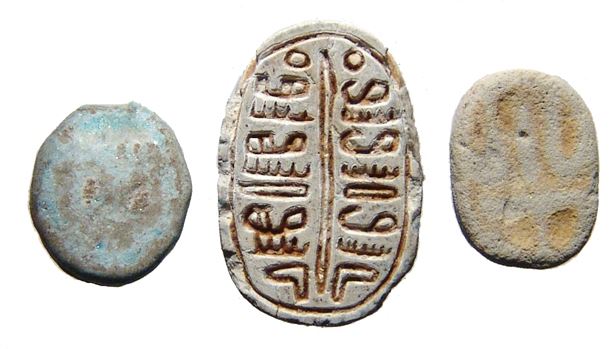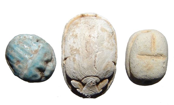 A lot of 3 Egyptian scarabs. Lot includes a 2nd Intermediate type, c. 1674 - 1570 BC, with two vertical columns of symmetric signs, the body nicely carved. (1.8 x 1.2 cm). The other two are Late Period examples, c. 664 - 30 BC, one with large facial features, probably from the workshops at Naukratis. (1.2 x 1 cm) & (1.3 x 1 cm). Ex Orange County private collection.
