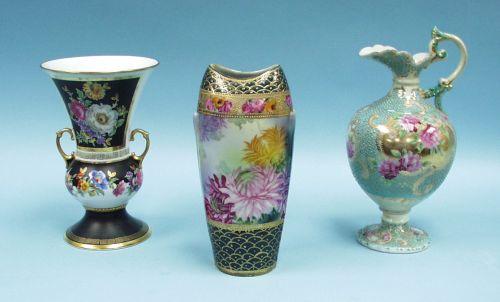 A lot of 3: a pair of German porcelain vases each decorated with flowers, and a porcelain decanter, with a scroll handle and relief gilt bead decorations. 9 1/2" to 11" high.