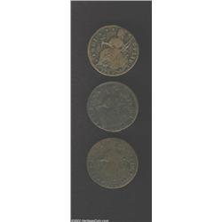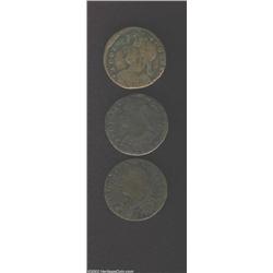 A lot of Uncertified 1787 COPPER Draped Bust Left Connecticut Coppers that includes: M. 33.17-gg.2, R.5, Good 4 Corroded, light brown color, rough surfaces, well centered, die crack (as made) through the final obverse cinquefoil; M. 33.19-Z.1, R.4, VG8 Corroded, the reverse is especially bold, most of the date is on the flan; and a M. 33.11-Z.18, R.6, Fine 12 Corroded, the upper obverse has green verdigris, die break (as struck) above TO in AUCTORI, the reverse is pleasing. Listed on page 43 of the 2003 Guide Book. 3 coins Important notice: We expect to be auctioning lots at the rate of 200-250 per hour. Sometimes eBay Premier live bid software cannot keep up with that pace, so we strongly recommend that you place a realistic proxy bid now as insurance to avoid disappointment. Also please note that all Heritage/CAA lots purchased through eBay Premier carry a 20% Buyer's Premium. Please make sure you read the Terms and Conditions.
