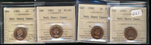 A lot of four Proof-like HEAVY CAMEO red pennies. Includes 1957, 1960, 1961 and 1965 Type 1. All 4 coins are ICCS PL65 Heavy CAMEO.