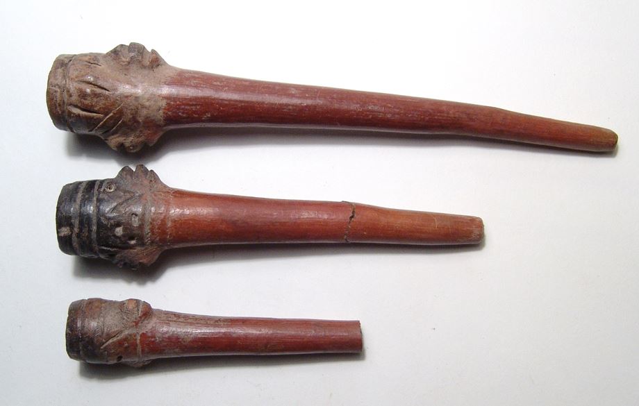 A lot of the Colima cigar holders, West Mexico, c. 300 BC - AD 500, the shafts with nicely burnished orange slip, the ends in the form of a styled monkey, slipped in black.