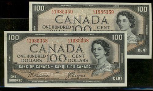 A lovely consecutive pair of BC-35b 1954 $100 Beattie-Coyne Devil's face A/J1985359. Both notes are original and choice uncirculated.