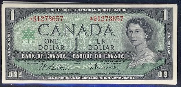 A lovely run of sixteen consecutive replacement notes. BC-45bA 1967 $1 Beattie-Rasminski, *B/M1273657 TO 672. All notes are Choice Unc.
