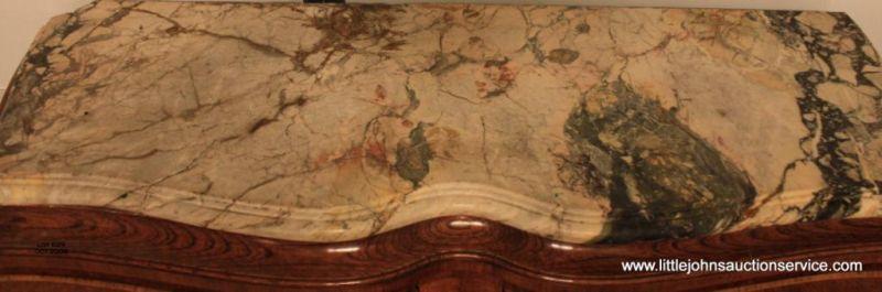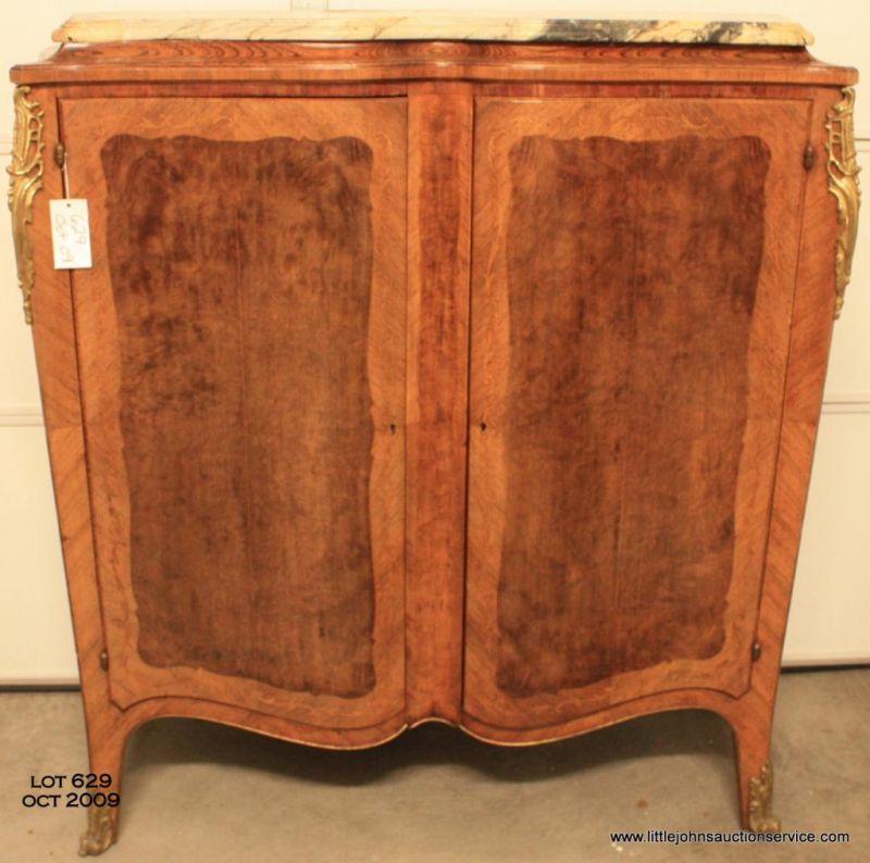 A magnificent Louis XV style bombe front fruitwood commode, gilt bronze mounts, with variegated marble top (cracked). The fruitwood is solid, not veneer and is beautifully inlaid throughout with exotic hardwoods. A full 56 inches high by 48inches wide with three internal shelves. Circa 1900. Estimate $2,500 - $3,500