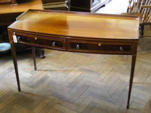A mahogany bow-fronted side table, line-inlaid and cross-banded, W 122cms D 57.5cms £120-180