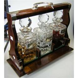 A mahogany tantalus, together with three cut glass decanters and three silver labels for Whisky, Gin and Sherry, 38cm wide (7) £300-500