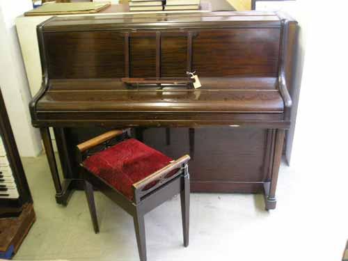 A mahogany upright piano by Rogers, London, iron-framed and overstrung, and a piano stool, H 150cms W 141.5 cms (piano) £80-120
