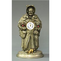 white metal, France, 19 th century, old lady carrying 2 dogs showing their tounges in beat with the clock, height 26 cm; one hand missing