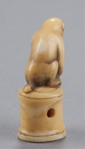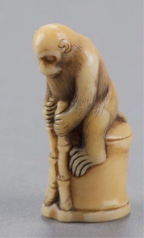 Early 19th century. Seated on a section of Bamboo and grasping two nodes that have grown from the base of the section that he sits on, he appears frustrated that he cannot pull them loose, the naturalistically carved hair. Unsigned. 1 7/8in (4.7cm).