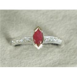A marquise ruby ring with diamond set mounts and shoulders, set in 18ct gold, size P Est. 150/200...