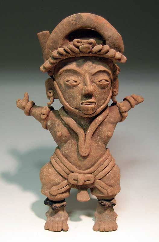 A marvelous Vera Cruz figure from Mexico, c. AD 300 - 900, this superb Remojadas example depicts a priestess ceremonial dancer with arms held high and upward facing palms. She is elaborately adorned with a fancy, helmet-like headdress decorated with the knotted bow emblem, which also is evident on two of the bracelets and complex, belted loincloth. Chapopote daubed rattles encircle the legs. H: 15 in. Strong mineral deposits and root marks, typical small losses and minor repairs. Great presence. Ex Kusner collection. Cf. Leyenaar Von Kuste Zu Kuste, page 112.