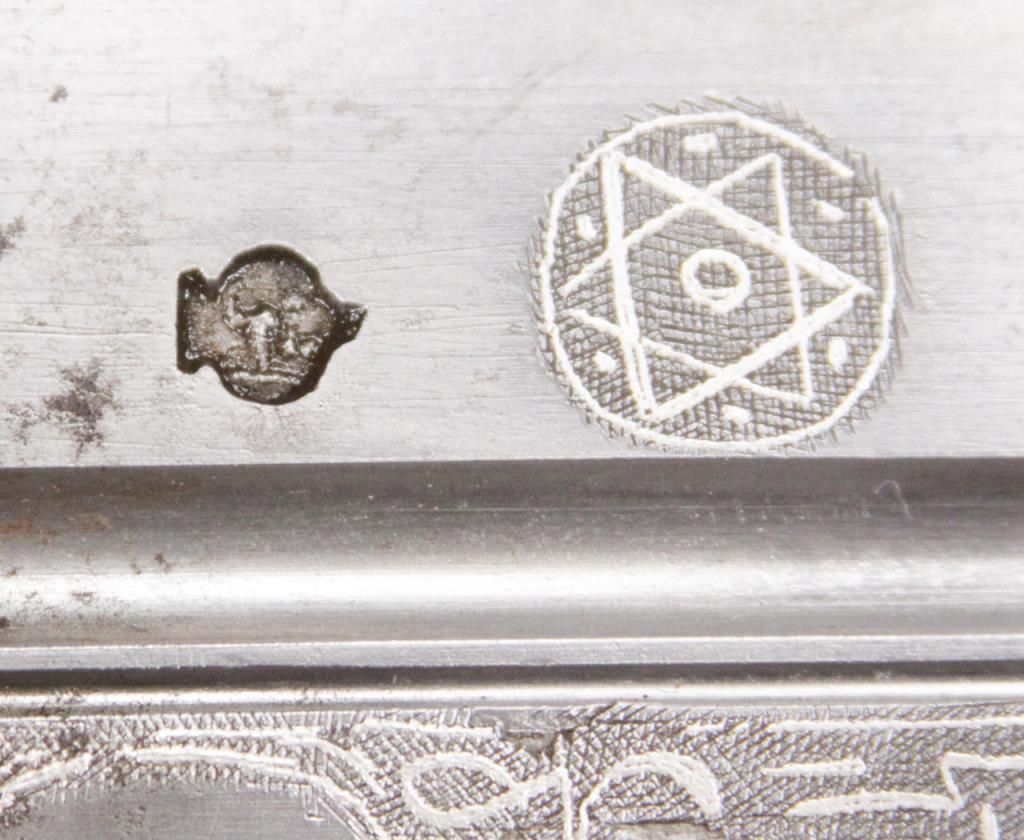 A massive example of a Caucasian kindjal with a one piece horn grip. The long, broad, double-edged blade has two fullers running down each side and is struck with maker’s marks on both sides. Blade also has silver inlayed decorationand writing including a date 1127 which translates to 1715. Leather covered scabbard with iron mounts. The top mount is struck with the same maker’s mark as the blade. Early 18thcentury. Good condition, worn handle, toning and somepitting at base of blade and on bosses on handle. Blade measures 18” long and 2 ¾” wide. Measures 24 ½” overall. Est.: $800-$900.