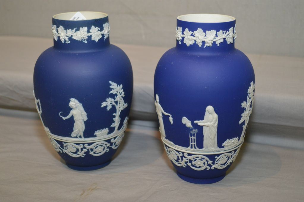 THIS ITEM NOT AVAILABLE FOR SHIPPING. LOCAL BIDDERS ONLY. A matched pair of cobalt blue Adams Jasperware vases decorated in a neo classical design 8 1/2" in height
