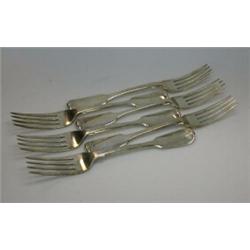 A matched set of six William IV silver fiddle pattern table forks, four by Mary Chawner, London 183.