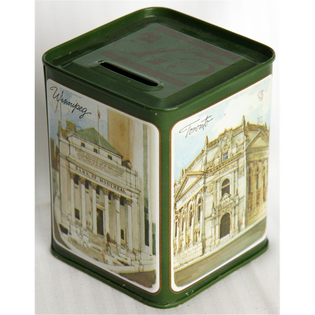 A medium size rectangular shaped can. Coin slot on top. 8cm x 8cm x 10cm. Green and white. EF.