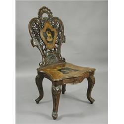 A mid 19th century continental walnut sidechair, with a pierced inlaid and pen work back and s...