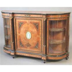 A mid Victorian figured walnut and ebonised credenza, the central door with oval green jasper classical medallion, flanked by gilt metal mounted corinthian columns and bowed glazed ends on toupie feet, 5ft.6ins. £2,000-3,000