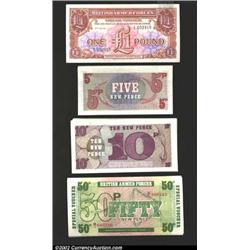 A mini-hoard of Great Britain British Armed Forces Special Vouchers, all grading Choice CU to Gem CU, including: (6) 6th series 5 pence; (53) 6th series 10 pence; (3) 6th series 50 pence; and a 3rd series $1. 63 notes