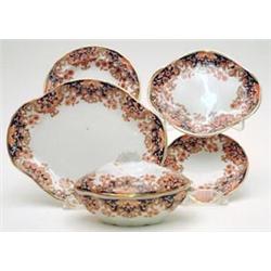 A miniature earthenware dinner service comprising 2 covered tureens on stands, larger stand and 12 plates, printed with set-patterns in red, green and black £60-80