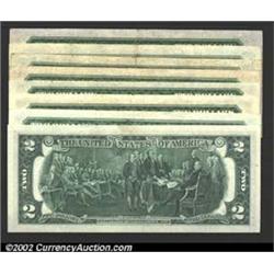 A miscellaneous lot of (8) $2 bills, including seven red seals and a 1976 FRN star note, grading Fine to AU. 8 notes