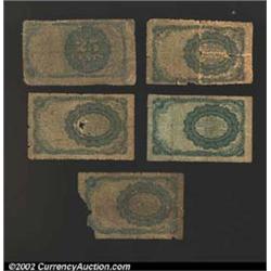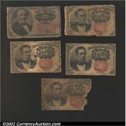 A miscellaneous lot of Fractional Currency, including four Fifth Issue 10¢'s and one Fifth Issue 25¢. All are VG or worse and most have problems. 5 notes