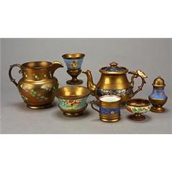 A miscellaneous selection of mostly copper-lustre pottery, comprising; a pepper-pot, two salts, t...