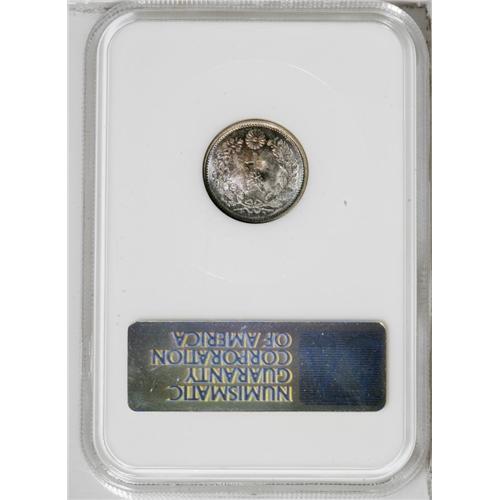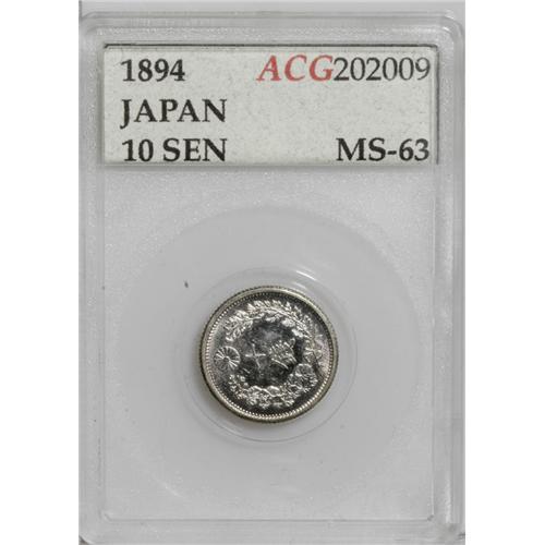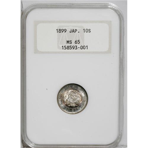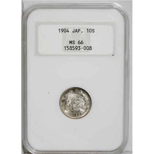 <B>A mixed certified 10 Sen trio including:</B></I> Meiji 27 (1894), MS63 ACG; Meiji 31 (1898), MS65 NGC (the holder incorrectly states the date as 1899); and a Meiji 37 (1904), MS66 NGC.