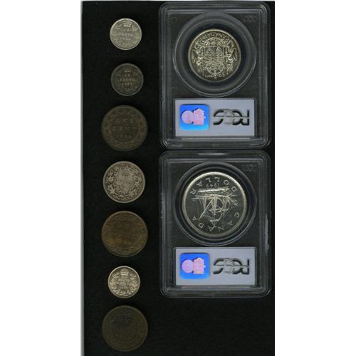 <B>A mixed certified and raw lot including:</B></I> Cent 1858, VG; Cent 1888, XF with an obverse flan flaw; Cent 1900H, lustrous AU-UNC; 10 Cents 1871H, VF with obverse scratches; 10 Cents 1883H, harshly cleaned VF with scrapes on the obverse and scratches reverse; 10 Cents 1935, XF-AU; 25 Cents 1893, VG; 50 Cents 1949, MS62 PCGS; and a Dollar 1949 MS63 PCGS. <B>A sold as is, no return lot.</B></I>