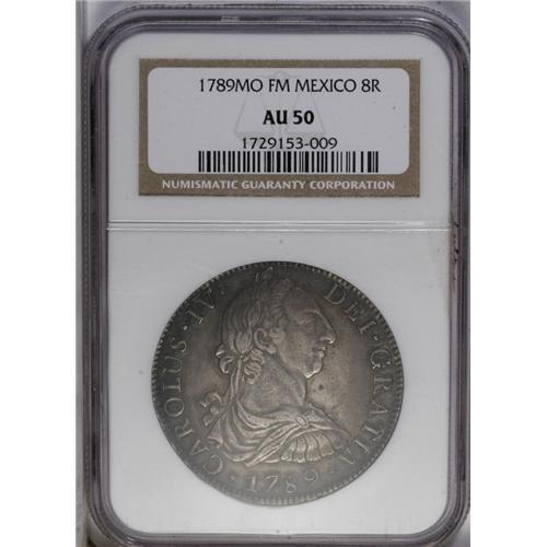 A mixed trio including: 8 Reales 1789 Mo--FM, AU50 NGC;