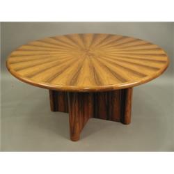 A modern Gordon Russell circular table, the top in segmental rosewood veneer, on a cross shape...