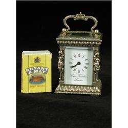 A modern miniature silver carriage clock in a cast case, the enamel dial inscribed 'Chas Frodsham...