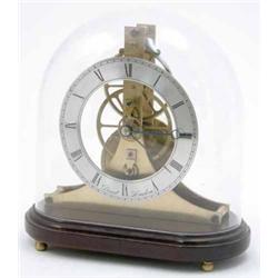 A modern skeleton timepiece by Dent, London, with silvered chapter ring, a three wheel train and dead-beat escapement, on plinth and under perspex dome. 9ins £250-300