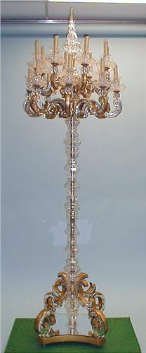 A monumental pair of French crystal grand salon candelabra. Each elongated stem with various shaped crystal segments, mounted with 16 light fixtures arranged in two rows. Each bronze base with scroll supports. 92" high. To be sold individually.