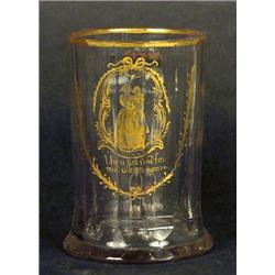 glass, 18 th century, round and facetted shape, gilded decor with rococo-style cartouch and the words: uner Lieb ind frei wird alle morgenneu, height 14 cm