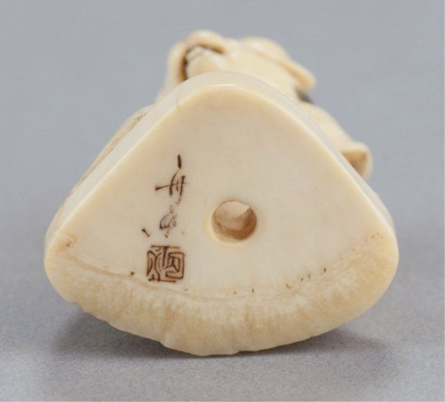 By Kawamoto Shuraku. Tokyo, Mid 19th century. , Mid 19th century. Seated on a dais, with open mouth, tongue out and the nose is stippled, he wears a ruff around his neck and the eyes and spots are highlighted with black ink. The outer crust of the tusk has been left intact as was his style. Signed on underside with seal, all highlighted in magenta, Shuraku. 1 1/2in (3.7cm).