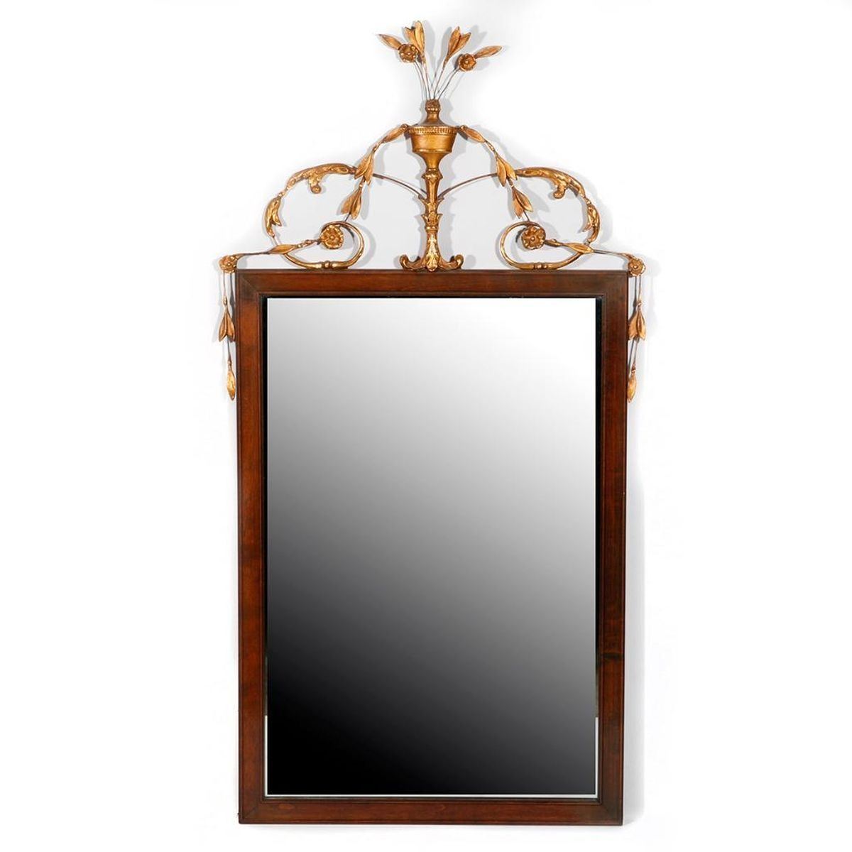 A gilt metal and wood neoclassical style mirror measuring 47 inches high x 24 1/2 wide.