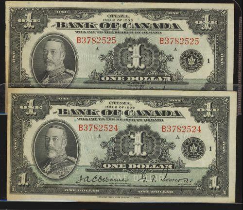A nice consecutive pair of BC-1 1935 $1 English text B3782524 and 2525. Both EF-AU or better.
